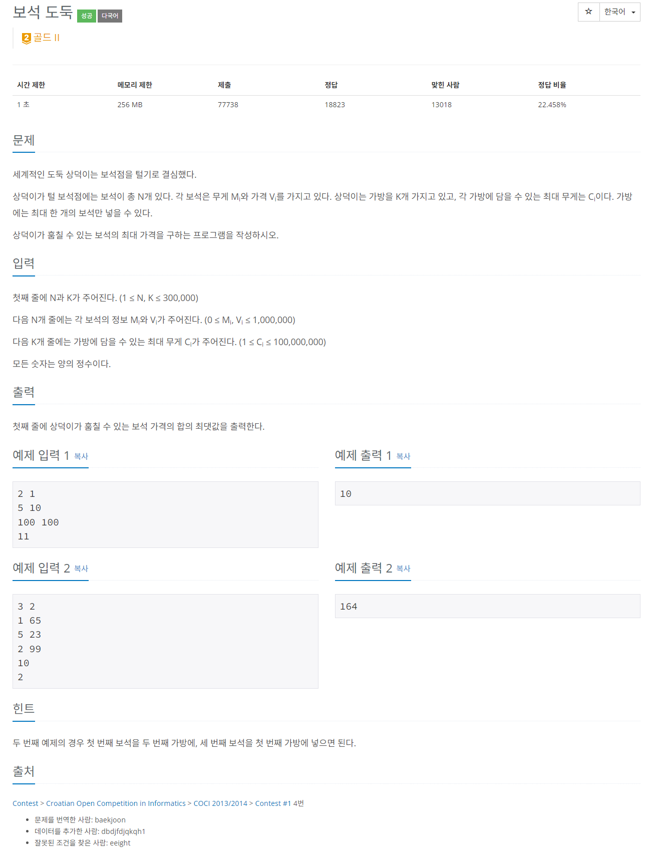 * tempJewels는 값 V가 높은 순으로 정렬되게 Comparator로 정의해준다.(나는 무게까지 비교했는데 이거도 없어도 된다.)